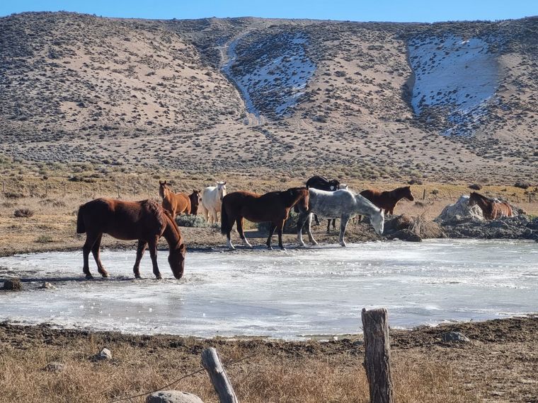 Un escenario es atípico para el otoño, que suele ser lluvioso. El frío dejó curiosas postales: un niño jugando al fútbol en su pileta congelada o caballos en Comallo que intentan beber agua de un río congelado.