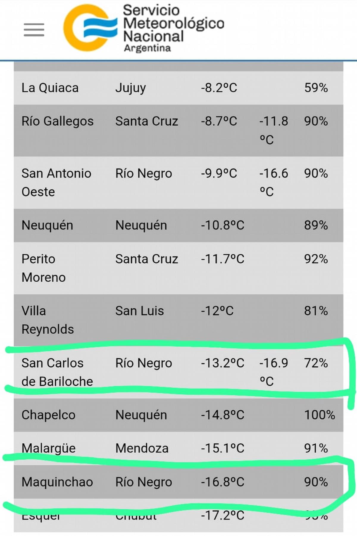 En San Carlos de Bariloche, el termómetro marcó esta mañana -13,2°C, con una sensación térmica de -16,9°C; mientras que en Maquinchao se registraron -16,8°C. En tanto, el domingo la localidad de Mencué, en la Línea Sur, batió un récord con -20°C, consolidando esta jornada como una de las más frías de los últimos años.