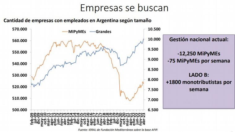 Desde diciembre de 2019 a abril de este año, con base en datos de AFIP, “se perdieron 12.250 empresas MiPyMEs, son 75 empresas menos por semana. En cambio se crearon más de 1.800 monotributistas; por semana, se crearon 24 monotributistas por cada empresa que cerró”, le dijo a Cadena 3 Marcos Cohen Arazi.