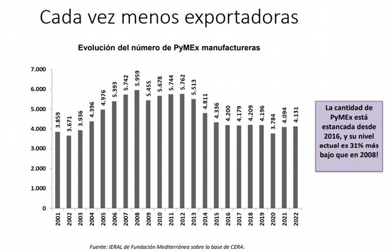 “Existen 31% menos PyMEx (pyme exportadora) que en 2008; influyen en esta decepcionante performance las recurrentes apreciaciones cambiarias, como también la inestabilidad macroeconómica y de reglas de juego”, comentó el economista.