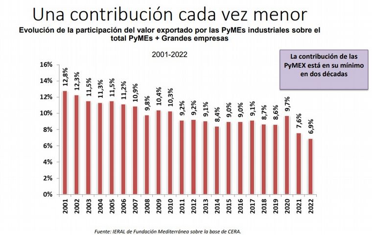 En línea con lo anterior, actualmente las PyMEx explican menos de 7% de las exportaciones, cuando a comienzos de los 2000 representaban 12% del total. La contribución de las Pymex está en su mínimo en dos décadas.