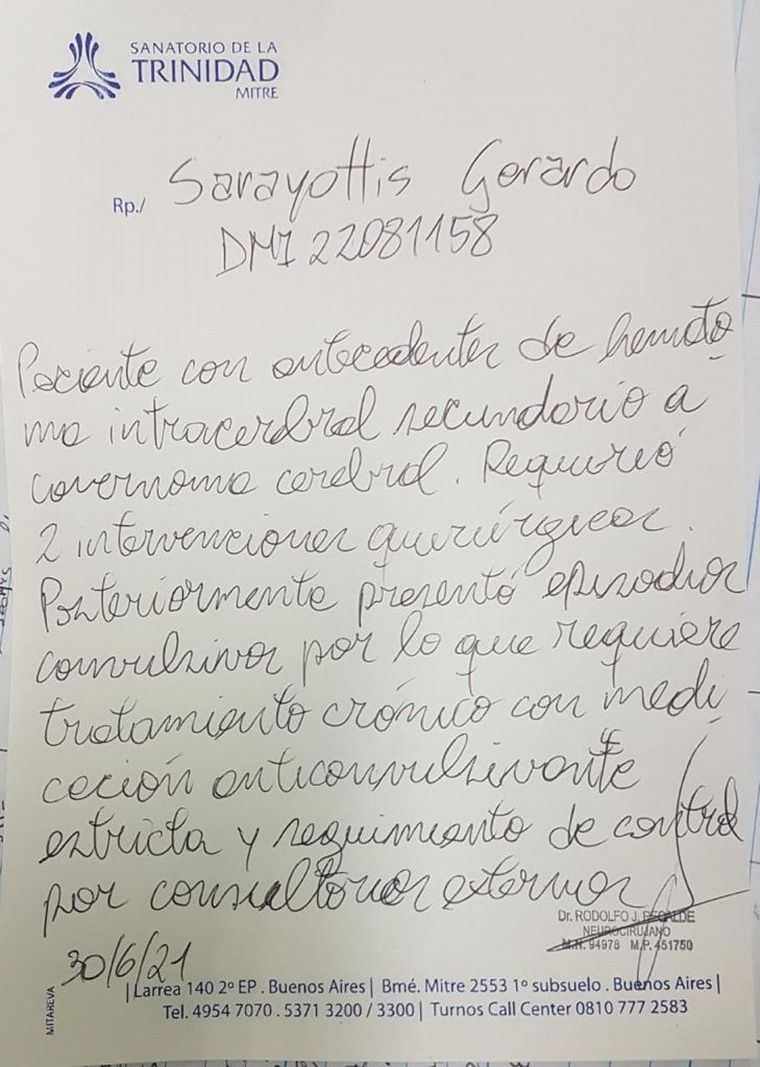 "Tengo documentación que acredita lo que tengo. El tema es poder viajar yo por el problema neurológico", reiteró.