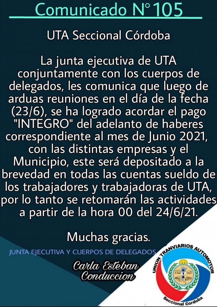 En tanto, Marcelo Mansilla, secretario de Movilidad Urbana de la Municipalidad de Córdoba, dijo a Cadena 3: “Pudimos destrabar el conflicto facilitando, con mucho esfuerzo, los fondos para que se pueda hacer efectivo el pago del vale de los trabajadores”.