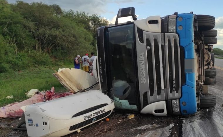 El vehículo que iba desde Santiago del Estero y llevaba más de 23 mil kilos de carne (11 mil en el chasis y 12 mil en el acoplado), bajó a la banquina y volcó mientras tomaba la curva.