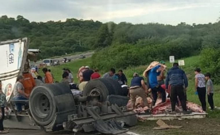 Todo el cargamento que llevaba en el chasis (11 mil kilos entre achuras y media res), quedaron esparcidos sobre la calzada. La gente comenzó a llegar al lugar para llevarse todo.