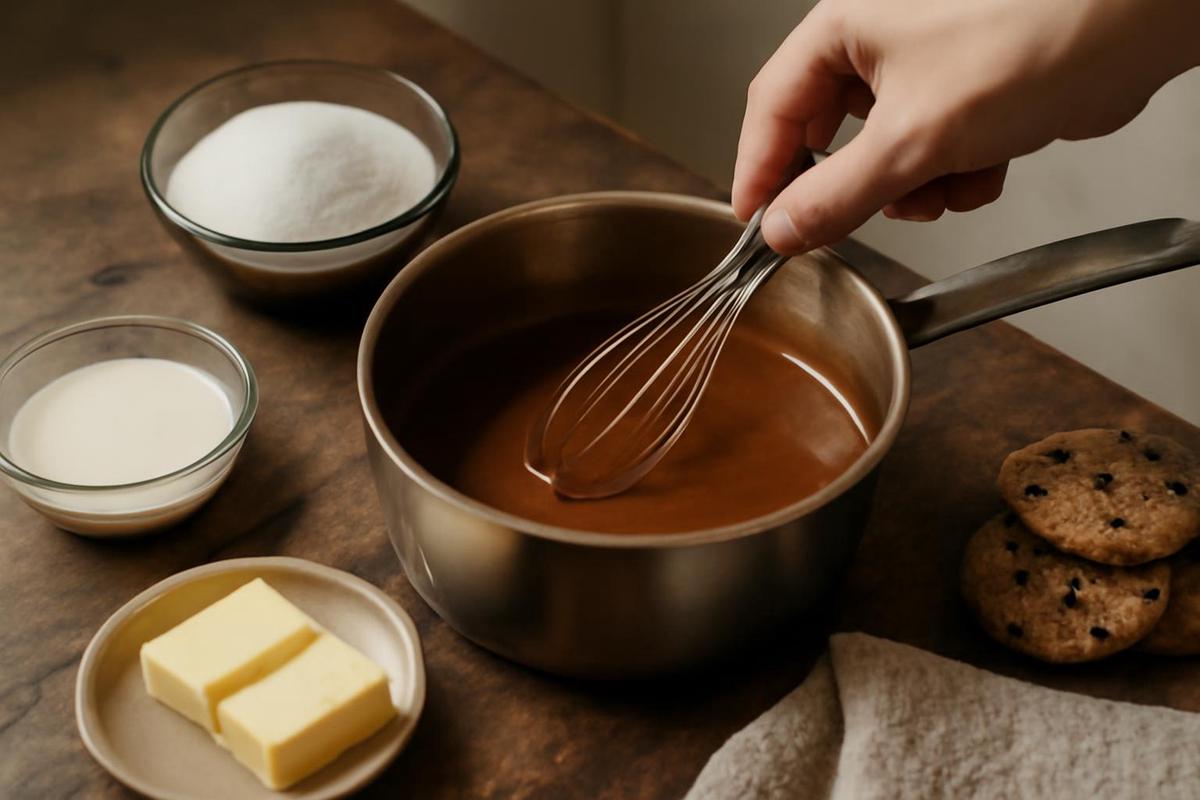 Una vez alcanzado el color deseado, se baja el fuego al mínimo y se agrega la mantequilla, removiendo hasta que se derrita por completo. Luego, se incorpora la nata y se sigue mezclando a fuego bajo hasta que todo quede bien integrado. Finalmente, se añade la sal, se remueve una vez más y se deja enfriar antes de transferir el caramelo a un recipiente de vidrio hermético.
