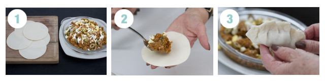 Picar la cebolla y saltearla en aceite vegetal. Cuando esté transparente agregar la carne de ternera molida y cocinar poco, hasta que cambie de color. Otra forma de “cocinar” la carne es colocarla en un colador y rociarla con agua hirviendo. Luego condimentar con sal, pimienta, pimentón, comino y ají molido y por último dos cucharadas de grasa. Apagar el fuego, dejar reposar y enfriar. Hervir los huevos, enfriarlos y picarlos. Hervir los cubos de papa y dejarlos “al dente”. Cortar las aceitunas descarozadas en rodajas y agregarlas junto con los huevos. Para el armado, separar las tapas, tomar de a una y colocar en el centro un poco de relleno. Agregar el huevo picado con las aceitunas y la cebolla de verdeo cruda. Cerrar bien humedeciéndole el borde con agua para que no se abran. Repulgar, freír en abundante aceite vegetal cuidando de regular el calor para que no se quemen. Escurrir sobre papel absorbente y servir bien calientes. Si van al horno, debe ser a fuego fuerte no más de ocho minutos para que el relleno llegue jugoso a la mesa.