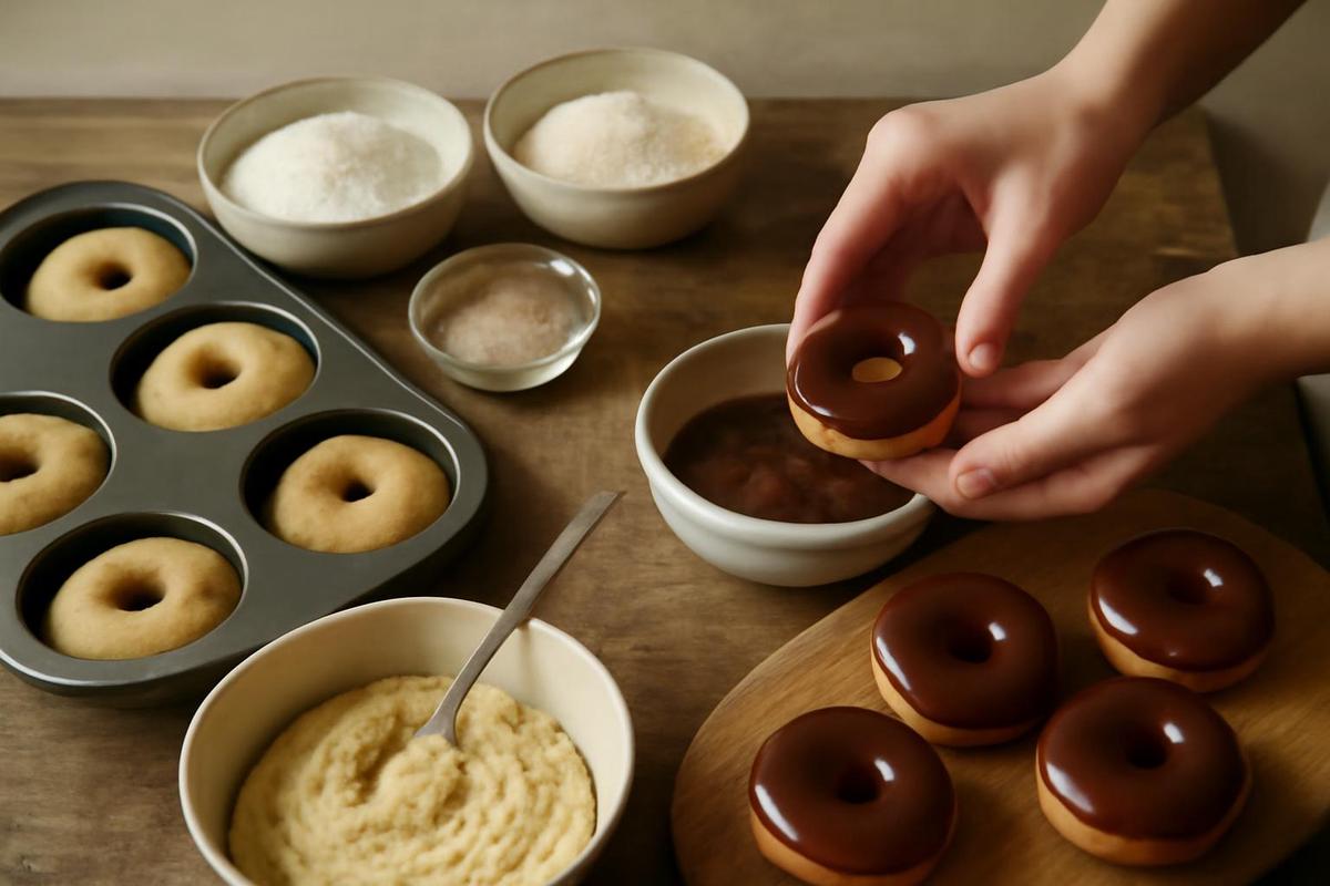 El molde se rellenó hasta tres cuartos de cada cavidad, evitando el exceso de masa para asegurar una cocción uniforme. Se hornearon los donuts durante 13 a 15 minutos a 180º C, y una vez listos, se dejaron reposar diez minutos antes de desmoldar y enfriar sobre una rejilla.