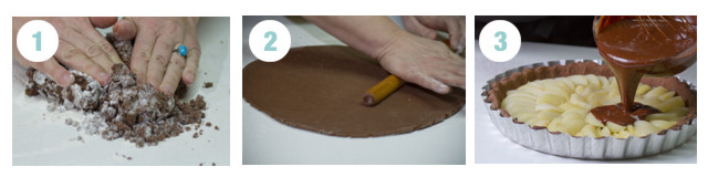 Para la masa, unir en una procesadora la harina, la manteca, el cacao y el azúcar impalpable. Darle unas vueltas hasta integrar los ingredientes y por último formar la masa con un huevo y el agua fría. Formar el bollo, estirar y colocarlo en un molde de 26 cm. Pinchar la superficie con un tenedor y hornear por 10 minutos a 180°. Retirar. Para la cocción de las peras, colocarlas sin piel ni semillas en una cacerola con el azúcar, la canela, el jugo de limón, unas gotas de vainilla y 500 cc de agua, a cocinar por 15 minutos. Retirar y dejar escurrir. Para el relleno de chocolate, en una olla colocar la crema de leche, unas gotas de vainilla y la leche, llevar al fuego hasta que rompa el hervor. Retirar y volcar sobre el chocolate picado. Remover hasta homogenizar la mezcla, dejar enfriar unos 15 minutos y agregar el huevo con batidor. Para el armado, sobre la masa pre cocida colocar las peras en gajos, verter el relleno de chocolate y llevar a horno nuevamente 30 minutos a 180°. Retirar y dejar enfriar. Antes de servir espolvorear con cacao en polvo.