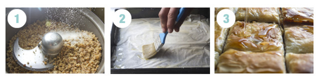 Pincelar una placa con manteca clarificada (*) y colocar por encima una capa de masa philo, enmantecarla y repetir este proceso en 10 capas. Luego poner el relleno compuesto por las nueces y el azúcar previamente mezclados con unas gotas de agua de azahar. Y luego tapar el relleno con otras 10 capas de masa philo con manteca clarificada entre ellas. Cortar en cuadrados de cinco por cinco centímetros y llevar a horno de 10 a 15 minutos. Por otra parte, colocar en una olla el agua, el azúcar y el jugo de limón, y llevar a fuego para realizar un almíbar punto hilo flojo. Cuando el baklawa se retira del horno se baña con este almíbar y se deja enfriar.