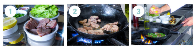 Hervir las mollejas por 20 minutos y llevar a heladera. Enfriar bien y luego cortar en tiras de un centímetro de espesor. Reservar. Cortar la panceta en tiritas. Lavar bien las hojas verdes y condimentar con un dressing de partes iguales de limón y aceite de oliva extra virgen de Traslasierra. Calentar bien el sartén, poner las mollejas, dorar de ambos lados, integrar la panceta y las arvejas. Salpimentar y por último, desglasar con el mismo dressing de los verdes.