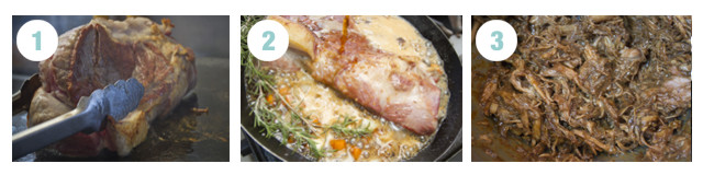 Sellar la bondiola en sartén de todos los lados y reservar. En una olla con aceite de oliva sudar la cebolla, zanahoria y los ajos. Desglasar con un litro de cerveza negra e incorporar el azúcar negro, el jengibre, el romero y el caldo. Llevar a hervor y luego reducir el fuego y cocinar hasta que la bondiola esté tierna. Desmenuzar la bondiola y reducir el líquido de cocción hasta la mitad. Incorporar el líquido reducido a la bondiola, mezclar y rectificar condimento. Para la cebolla caramelizada al vino tinto, sudar la cebolla sin coloración. Incorporarle la sal, el azúcar y luego el vino. Dejar cocinando a fuego muy bajo durante al menos una hora. Para el aderezo de yogur: mezclar el yogur natural, el jugo de un limón, una cucharadita de jengibre picado, sal y pimienta a gusto con batidor y reservar. Para el armado: realizar un tajo al pan pita sin separar las dos tapas. Untar con mostaza de Dijon el interior del pan. Mezclar dos cucharadas colmadas del braseado con una cucharada de las cebollas caramelizadas. Incorporar la mezcla anterior dentro del sándwich y luego el repollo en juliana. Agregar el aderezo de yogur a gusto.