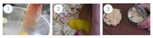 Colocar los filetes de trucha en una olla con agua hirviendo por tres minutos. Extraerlos con un colador, sacarle cuidadosamente la piel, dejarlos enfriar a un lado. Colocar en un bowl la cebolla, el ajo y el chile, y mezclar con el puré y la trucha desmenuzada. Agregar las hierbas, las yemas y sazonar. Extraer dos cucharadas colmadas de la mezcla y moldearla en medallones de dos centímetros de alto por seis de diámetro, pasarlos por la harina, luego por el huevo y por último por pan rallado. Poner un sartén a calentar con un chorrito de aceite, colocar los medallones hasta que se doren por un minuto, luego colocarlos en el horno precalentado a 180º por ocho minutos Para la salsa, con batidora durante un minuto, o vigorosamente a mano por tres minutos, mezclar las yemas con el vinagre, luego agregar muy lentamente e incorporar la manteca derretida aún caliente, de manera que el calor cocine las yemas hasta lograr una salsa homogénea y espesa. Servir cuatro “fishcakes” por comensal, rociarlos con salsa y servirlos con una ensalada bien completa y fresca.