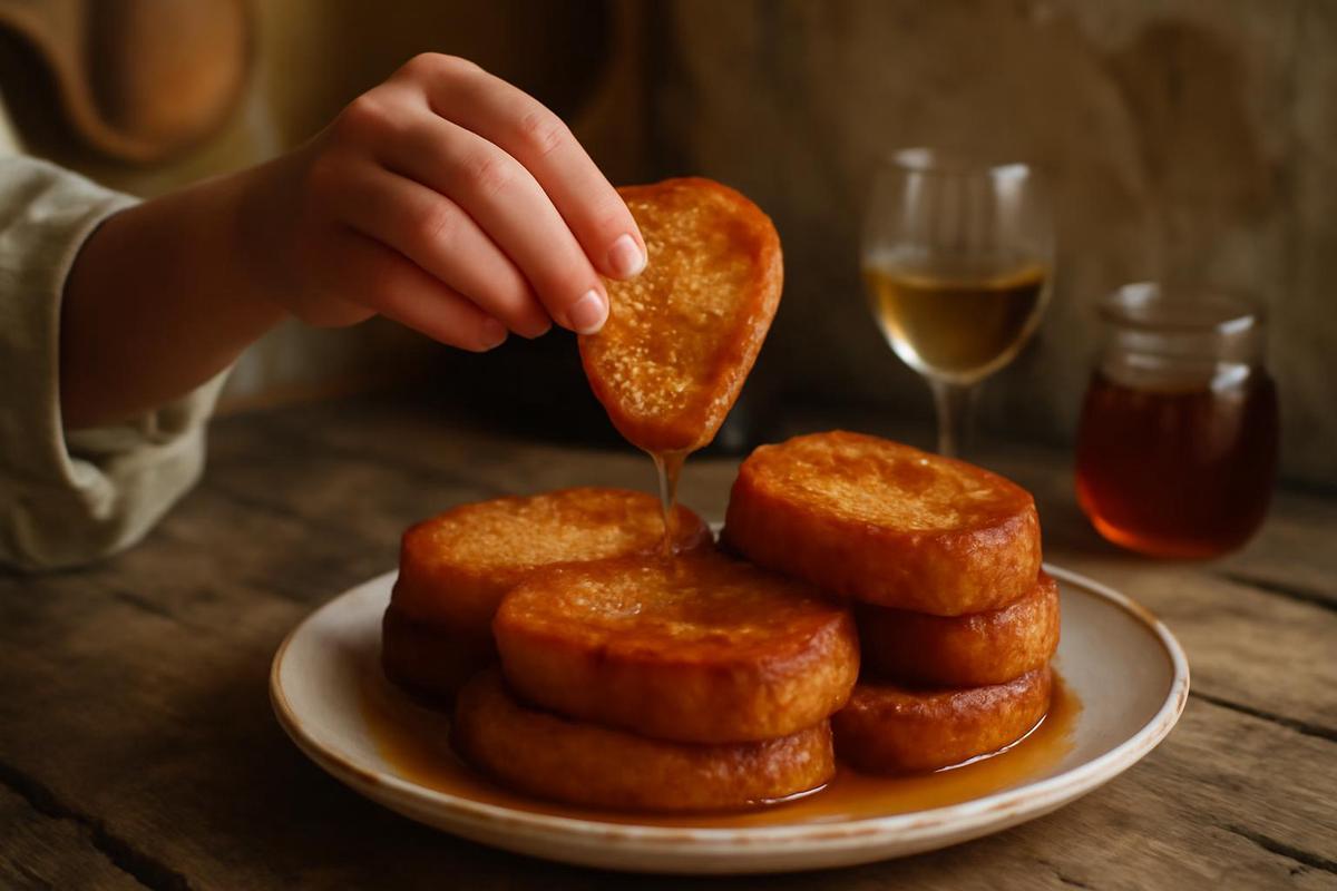 Se empapan rebanadas de pan en una mezcla de leche, vino y azúcar, se fríen y se sumergen en un baño de miel.
