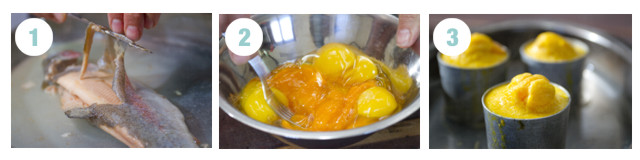 Colocar en una fuente las truchas salpimentadas, colocarles el vino blanco, tapar con papel de aluminio y llevar a horno mediano por 15 minutos. Para la salsa, verter en una olla el vermú blanco, dejar reducir al 20 por ciento y agregar el fondo de pescado, la crema y el salmón cortado en tiras finas. Cocinar durante 10 minutos y reservar. Para la guarnición, mezclar en un bowl el puré de calabaza con los huevos y la crema, salpimentar, llenar los moldes y llevar a baño María durante 40 minutos. Aderezar el berro con el aliño del aceite de oliva, y los jugos de la naranja y el limón.