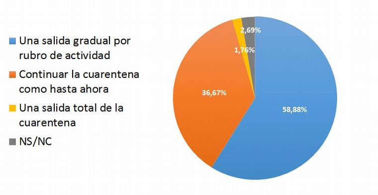 -El 58,88% considera más conveniente una salida gradual de la cuarentena. El 36,67% prefiere que la situación continúe como hasta ahora; y apenas el 1,76% opta por la salida total de la cuarentena.