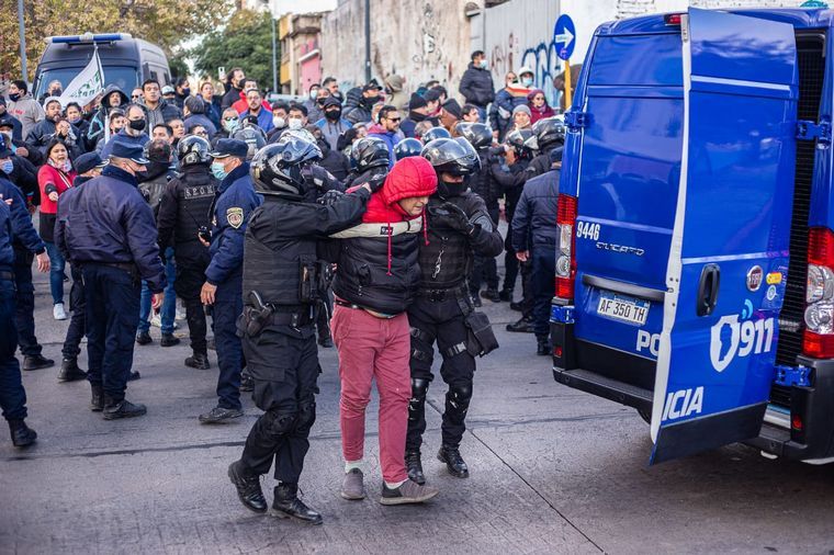 La Policía intentó desarticular la concentración y, en ese contexto, hubo forcejeos con los manifestantes quienes dañaron una motocicleta policial y le arrebataron el handy a un efectivo.