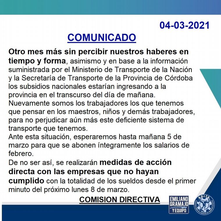 “Queremos comunicarle al ciudadano y al usuario que de no ser así no vamos a resentir el sistema. Vamos a tomar medidas de acción directa, retención de tareas, a las empresas que no totalicen el pago de salarios a partir del primer minuto del lunes. Será individualmente”, aclaró Gramajo.