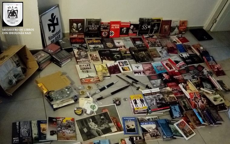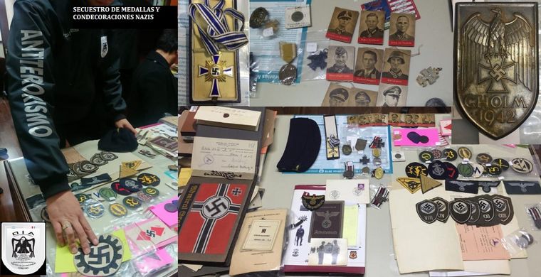 En distintos allanamientos encontraron libros, fotografías, sables, medallas, vajillas y hasta un busto de Hitler. La ley nacional 23.592 prohíbe "realizar propaganda" de estos elementos "basados en ideas o teorías de superioridad de una raza".