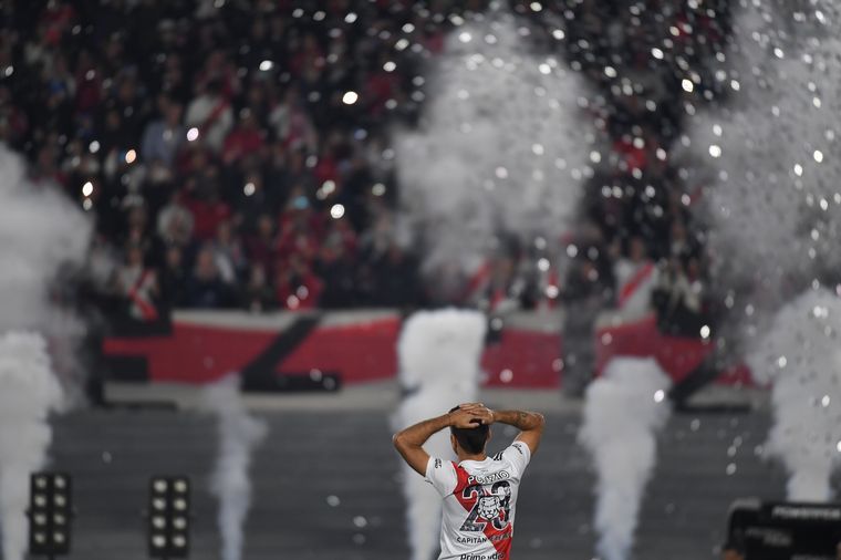 Con estas palabras y una canción interpretada por Soledad Pastorutti se abrió la noche en el colmado estadio riverplatense, que luego tuvo la entrega de una plaqueta y un cuadro con la camiseta 23 y la leyenda: "El capitán eterno", firmada por sus excompañeros. Además hubo otro enmarcado con los logros de su carrera y la cinta de capitán que usó durante tantos años.