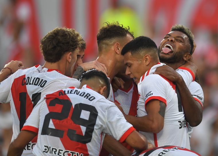 FOTO: Borja saca la lengua en el festejo de uno de sus tres goles ante Vélez.