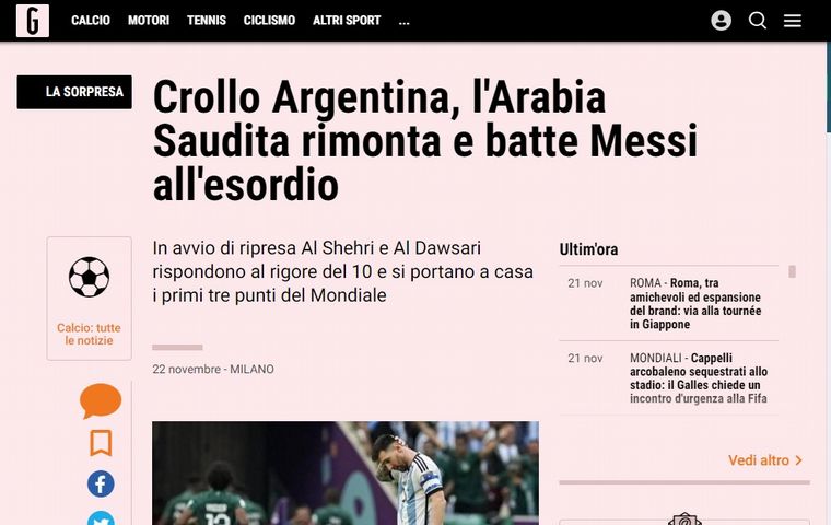 Por su parte, el diario italiano La Gazzetta Dello Sport analizó que Arabia Saudita remontó un partido y "abatió a la Argentina de Messi" e ilustró la nota también con una foto del rosarino mirando al piso.