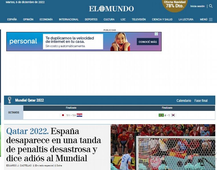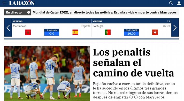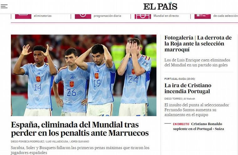Los medios españoles hablan hoy del "fiasco" luego de la eliminación tempranera de su seleccionado a manos de Marruecos -por penales- en los octavos de final del Mundial de Qatar.