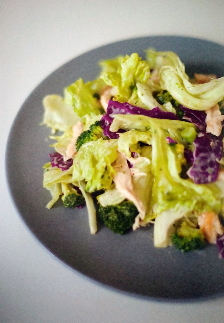 En un bol grande, mezclar las verduras el pollo y el aderezo.