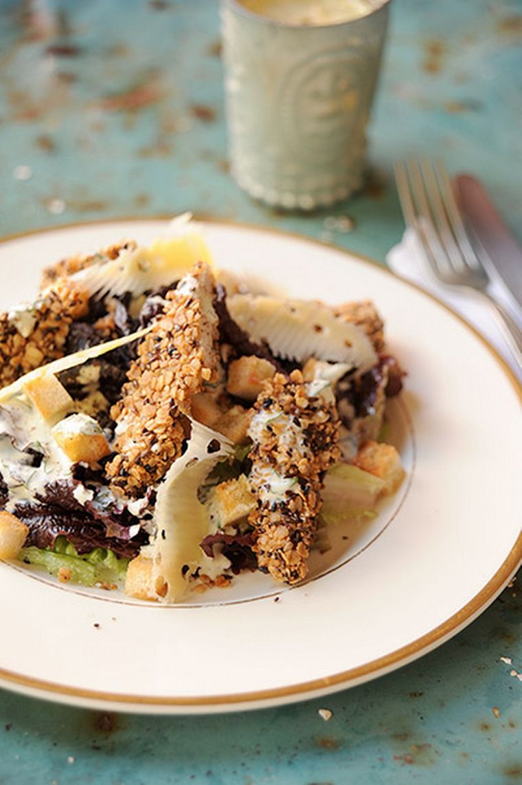 Armar la ensalada colocando las hojas bien prolijas, condimentar con bastante vinagreta y terminar la ensalada con croutons, láminas de parmesano y el pollo crocante.