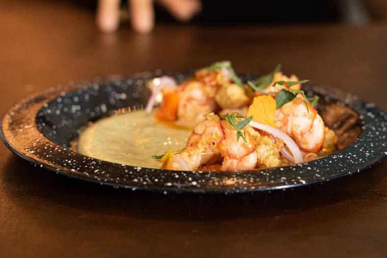 Las pupilas se dilatan con la llegada del hipon Taure, un colorido y estético plato con langostinos, salsa de hierbas y tofu fermentado, teura de verdura, lemongrass, acite de chile y maní.