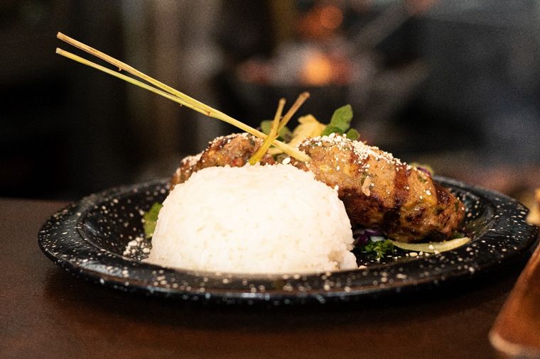 Continuamos con baboy lemongrass: brochette de cerdo y lemongrass a la parrilla, ensalada de hierbas y limón en conserva, arroz y salsa. Un plato sin T.A.C.C.