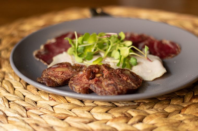 A continuación, una degustación de embutidos artesanales de elaboración propia: bresaola de ojo de bife con 20 días de maduración, lomito de cerdo ahumado y salame con castañas y ron. Una combinación ideal con los panificados, el aceite y el aceto.