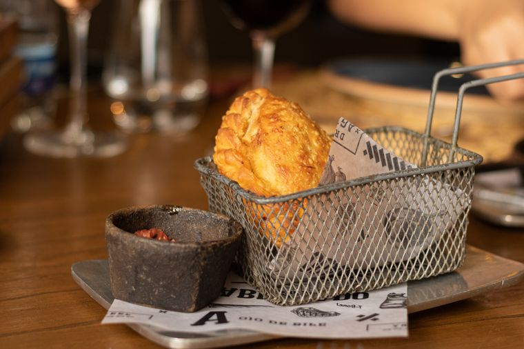 De entrada, provoleta con salsa criolla y empanada con salsa yagua.