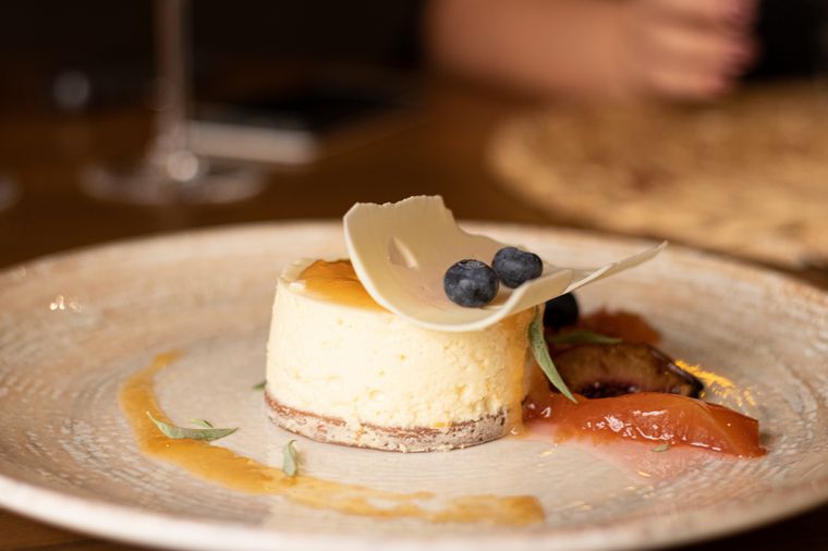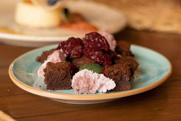 De postre, durazno -la fruta de la temporada- en tres texturas: cheesecake, quemado y en compota. Además, némesis de chocolate, granita de frutos rojos y marshmallow.