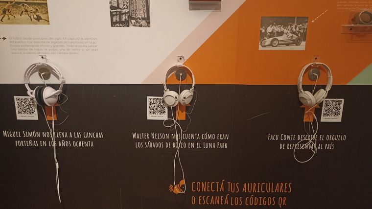 Por ejemplo, en una habitación donde muestran la evolución del rock: hay cuadros con la historia de las principales bandas a lo largo del tiempo junto con un código de Spotify para escanear que te lleva a una playlist con las mejores canciones. O en la historia del deporte, una pared tiene auriculares para escuchar a Walter Nelson contar cómo eran las noches de boxeo del Luna Park o a Facundo Conte explicando la historia de la selección de voley.