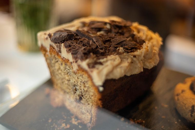 Para complementar el café hay opciones simples, ya que no hay mesas y sillas para sentarse. Son porciones de budín, cookies, scones y hasta un sándwich para llevar junto con el café.