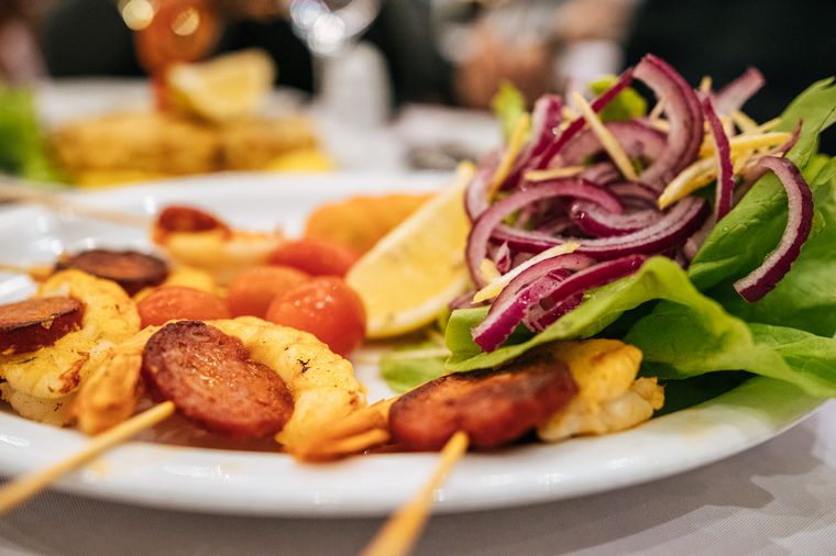 Pinchos de langostinos y chorizo colorado, la conjunción perfecta de mar y sierra. ($1.600).