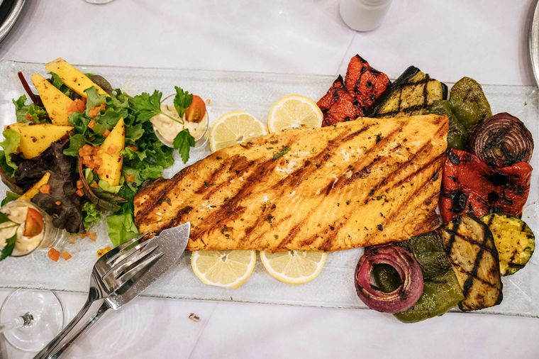 Filete de trucha patagónica a la parrilla con verduras asadas ($5.900, para compartir).