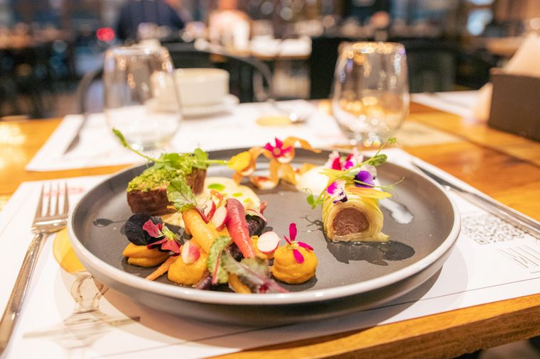 El plato debía integrar dos proteínas (lomo y molleja) con una salsa y tres guarniciones. Walter y Juan Manuel armaron un colorido ensamble de lomo en croute de maní, pate de mollejas envuelto en manzana verde con almíbar de cardamomo, anís estrellado y pimienta de Jamaica, vegetales encurtidos, papa crujiente, espuma de queso de cabra con corazón de gel de morrones asados y ají, salsa de maní, maíz y azafrán.