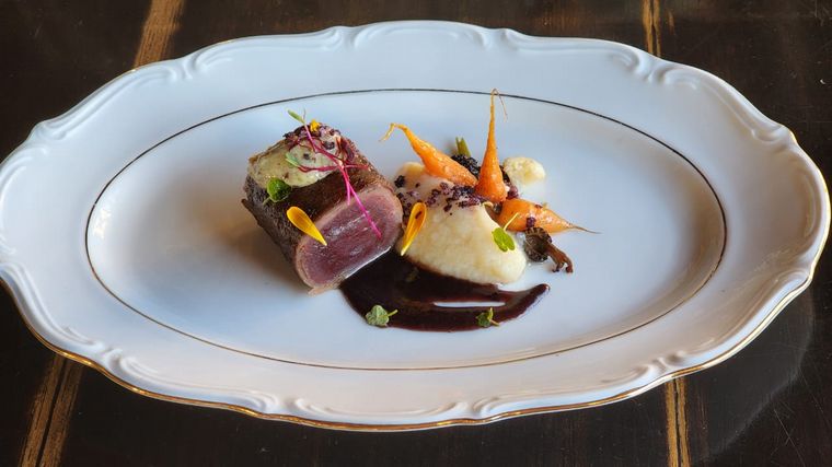 Para concursar, Alejandra presentó un bife de guanaco sellado con manteca de tuétano, puré de coliflor, zanahorias glaseadas y crocante de lomo curado. Para maridar, eligió Baron B Brut Nature.