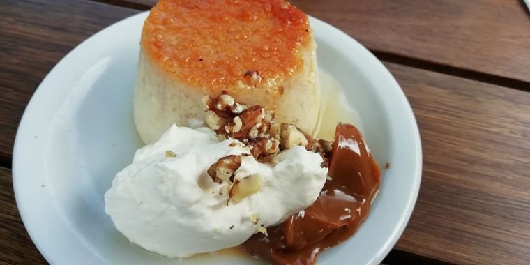 A la hora del postre, algo bien popular: budín de pan con crema y dulce de leche.