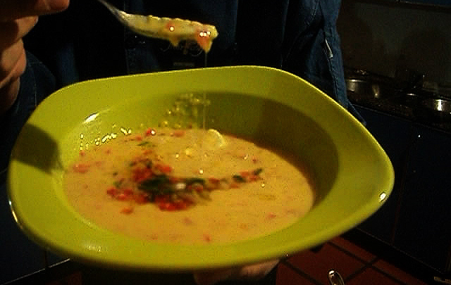 En una olla colocamos 2 cucharadas de aceite y agregamos la cebolla hasta transparentar, incorporamos un pimiento y cocinamos 3 minutos, ponemos los tomates, los choclos y el zapallo integramos los ingredientes con una cuchara de madera, salpimentamos e incorporamos la leche y el agua revolvemos y cocinamos hasta espesar. En una sartén colocamos el resto del aceite y agregamos el pimiento y la cebolla de verdeo, salpimentamos y cocinamos esta salsa por 7 minutos. Para servir colocamos en cada plato un trozo de queso, la humita y una cucharada de salsa.