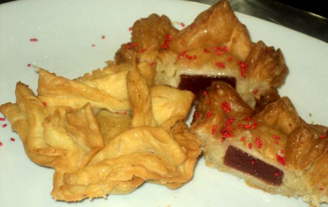 Masa: Hacer la masa con la harina, la sal, 50 g de manteca y el agua; dejar descansar 15 minutos; estirarla de 1 cm. de espesor, untar con materia grasa y espolvorear con fécula, doblarla por la mitad; untar nuevamente, espolvorear con fécula y doblar en cuatro.- Luego estirar muy fina y cortar cuadrados de masa; armar los pastelitos y freír, pincelando luego con el almíbar y salpicar con las granas.