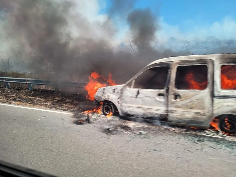 El foco comenzó cuando una camioneta Kangoo que circulaba por la ruta se incendió y, tras salirse de la banquina, provocó el fuego en los pastizales que rápidamente se extendió al monte.