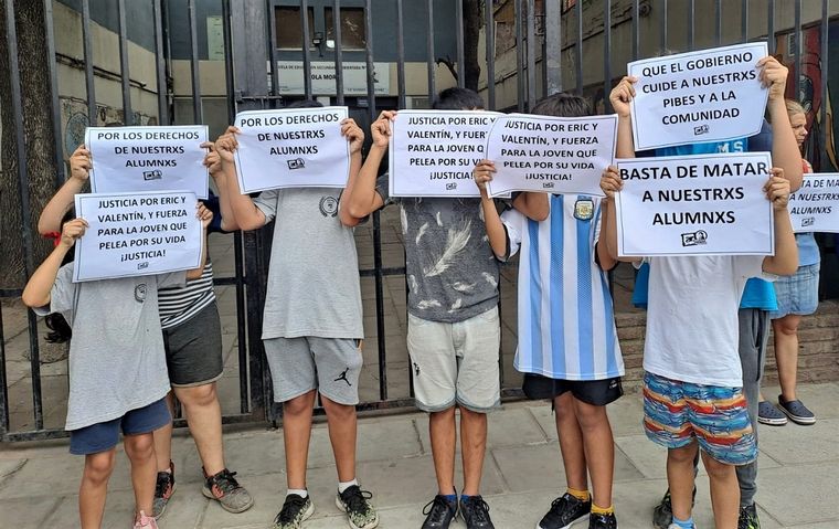 La comunidad educativa de la escuela Lola Mora, de la zona sur de Rosario, realizó un abrazo solidario tras el asesinato de los dos jóvenes de 14 y 15 años, que fueron baleados la semana pasada.