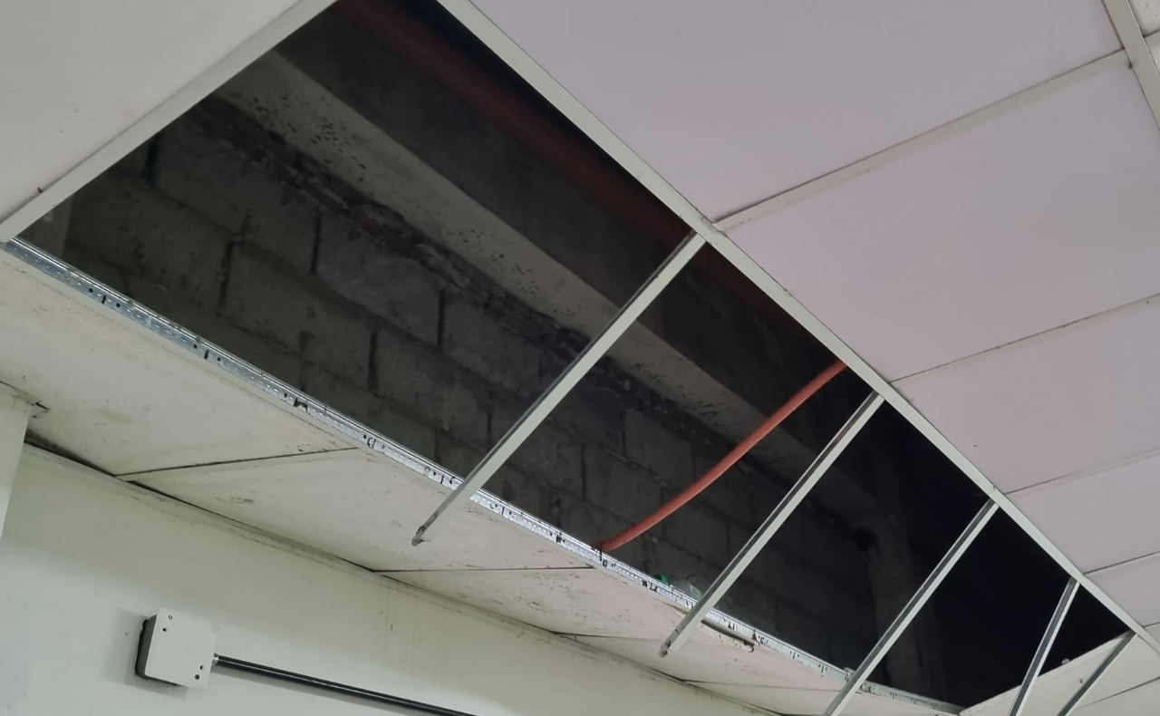 “Son de telgopor, si hubiera habido chicos no les pasaba nada”, aclaró luego. Referentes del Fondo de Asistencia Educativa (FAE) se hicieron presentes para proyectar la reparación del cielo raso.