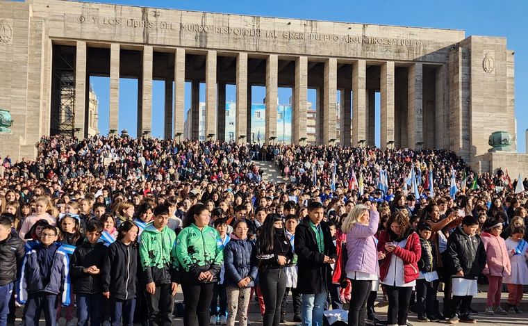 Beatriz, directora de uno de los colegios presentes en el acto, habló con el móvil de Cadena 3 Rosario, en Siempre Juntos, y dijo: “Esto me genera una emoción tremenda, los chicos están muy ansiosos, es un acto muy especial. Año a año está la misma emoción”.