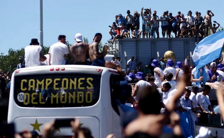 Los masivos festejos mundialistas dejaron un saldo de 24 heridos e imágenes impresionantes como la de los hinchas que se tiran del puente para caer en el techo del colectivo con los jugadores.