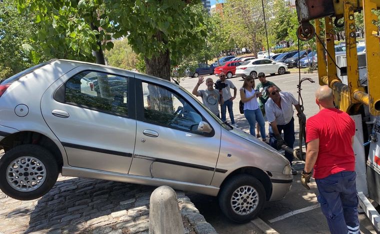 El vehículo estaba con las ruedas delanteras tocando el piso, las traseras en el aire y el medio del auto haciendo equilibro con el cordón del estacionamiento.