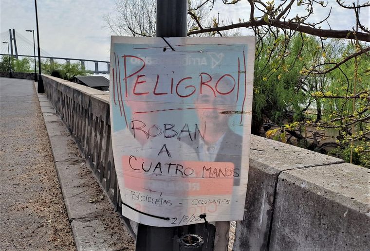 Un grupo de vecinos colocó en el paseo del caminante, bautizado como el “paseo del asaltante”, un cartel que advierte a rosarinos y turistas que ese espacio de la zona norte es un sitio inseguro: “Peligro, roban a cuatro manos”, reza la señal de alerta.